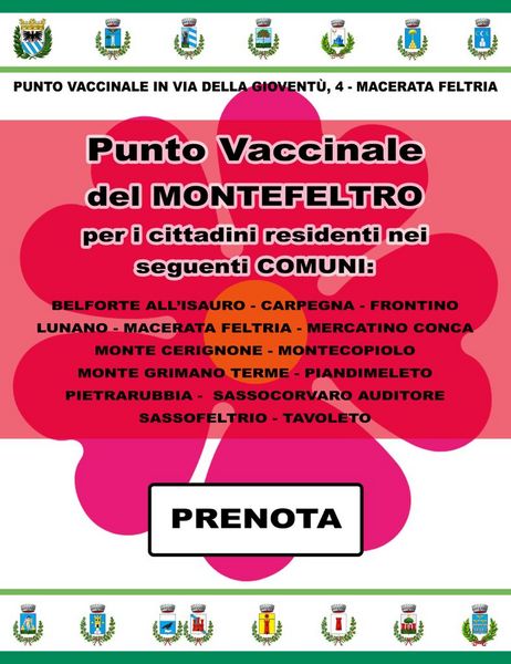 PUNTO VACCINALE DEL MONTEFELTRO -PRENOTAZIONI APERTE DAL 09 GIUGNO 2021 ORE 18.00
