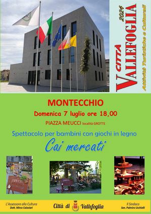 CITTA’ DI VALLEFOGLIA: spettacolo di “CAI MERCATI” con i suoi giochi di strada in legno per bambini in Piazza Meucci a Montecchio
