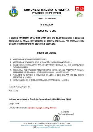 Ordine del Giorno del Consiglio Comunale del 30.04.2024 ore 18.30