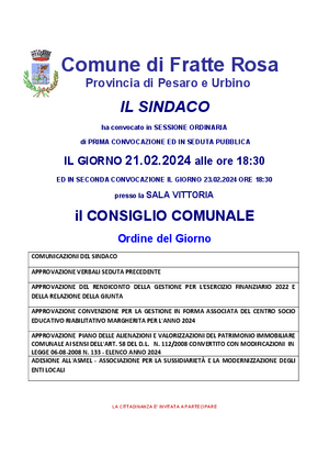 Il consiglio comunale viene convocato per il giorno 21/02/2024 alle ore 18:30 presso la sala comunale "Vittoria"