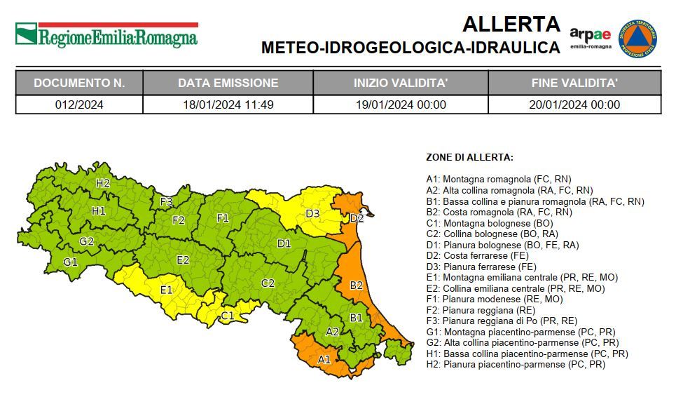 Per la giornata di venerdì 19 gennaio sono previsti in mattinata venti di burrasca moderata (62-74 km/h) sull'Appennino centrale e venti di burrasca forte (75-88 km/h) sul crinale orientale da sud-ovest. Sulla pianura nord-orientale e sulla costa sono previsti venti di burrasca moderata (62-74 km/h) da nord est dalla tarda mattinata o primo pomeriggio. Il mare sarà agitato al largo con altezza d'onda superiore a 3,2 metri e direzione d'onda da nord-est. Le condizioni del mare sotto costa potranno generare fenomeni di erosione del litorale, in particolare nel settore centro-meridionale. Si segnala che la piena in atto sul fiume Secchia transiterà nel tratto vallivo con livelli prossimi o inferiori alle soglie di attenzione nella mattina, in progressiva decrescita durante la giornata. Sono previste inoltre deboli precipitazioni che assumeranno forma di neve a quote superiori a 300-400 metri.