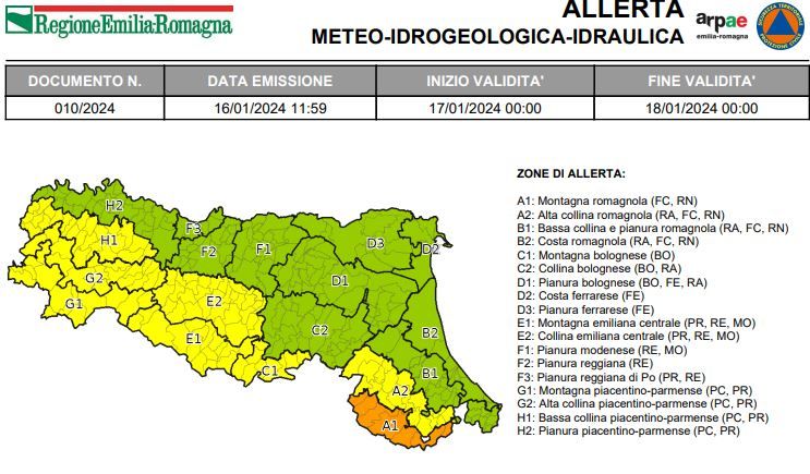 Per la giornata di mercoledì 17 gennaio sono previsti venti da sud-ovest di burrasca moderata (tra 62 km/h e 74 km/h ), in intensificazione sulla zona centro-orientale dal pomeriggio, con venti di burrasca forte (tra 74 km/h e 88 km/h). Sono previste precipitazioni moderate, più intense sulle zone appenniniche, che possono generare rapidi innalzamenti dei livelli idrometrici nei corsi d'acqua nelle zone montane centro-occidentali, con possibili superamenti dei livelli di attenzione e localizzati fenomeni di ruscellamento; sono inoltre possibili fenomeni franosi lungo i versanti caratterizzati da condizioni idrogeologiche particolarmente fragili. Sono probabili fenomeni di pioggia che gela nelle zone vallive collinari occidentali.