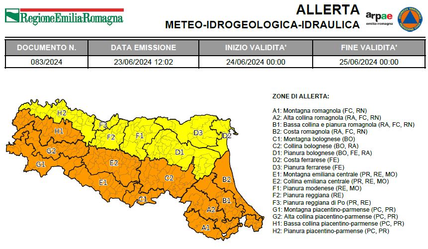 Per la giornata di lunedì 24 giugno sono previste piogge persistenti e abbondanti sul territorio regionale; nella prima parte della giornata le piogge saranno associate a fenomeni temporaleschi, anche di forte intensità con possibili effetti e danni associati, più probabili sul settore centro-orientale e sulle aree appenniniche. Sono possibili diffusi fenomeni di ruscellamento, frane su versanti fragili e rapidi innalzamenti dei livelli idrometrici nei corsi d'acqua in corrispondenza di precipitazioni di forte intensità, con possibile occupazione delle zone di espansione dei corsi d'acqua montani nel settore centrale della regione. Non si escludono limitati fenomeni di erosione della battigia per l'innalzamento del moto ondoso, che potrà raggiungere i 2m di altezza.