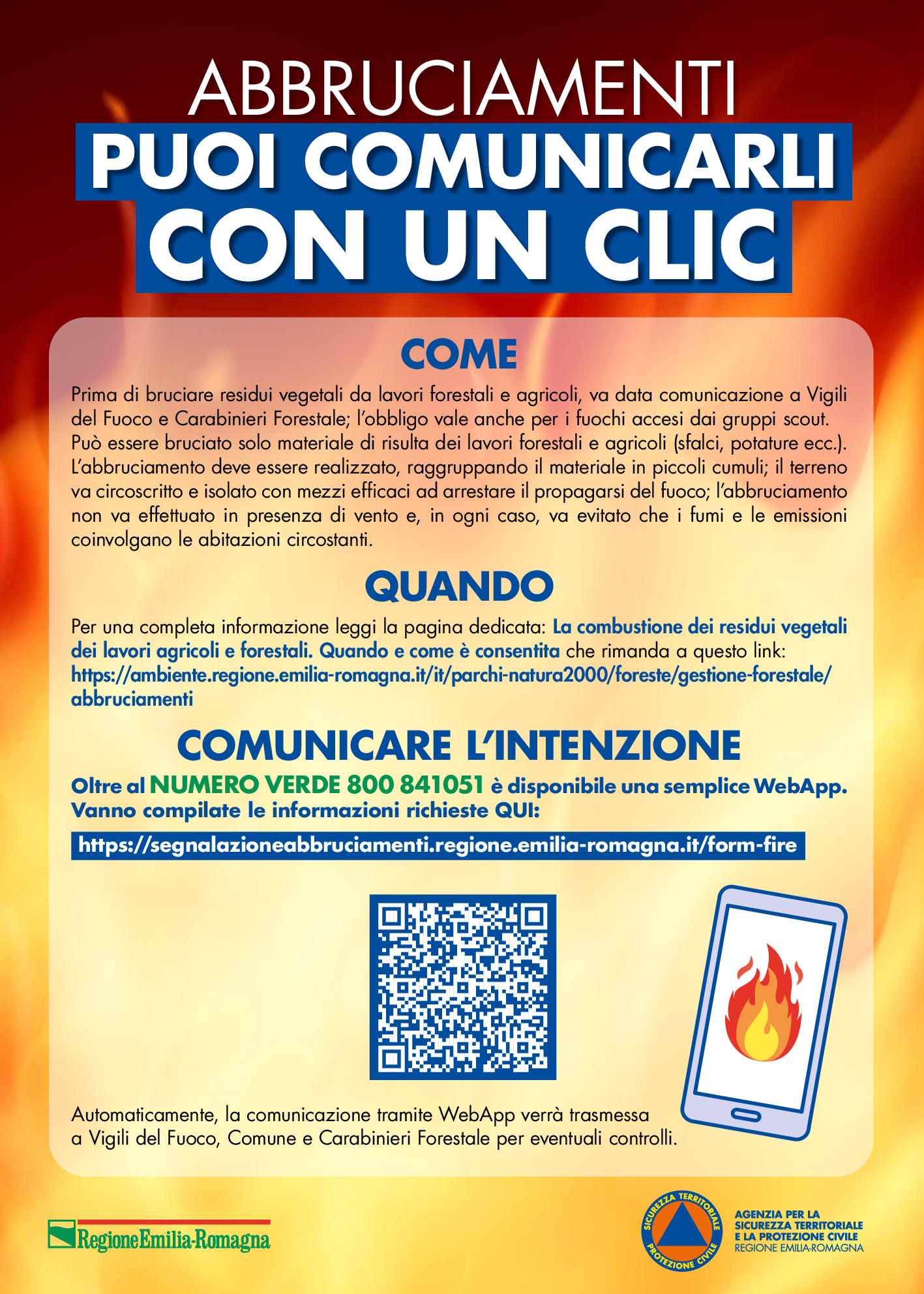 L’Agenzia regionale per la sicurezza territoriale e la protezione civile ricorda che, in ogni caso, prima di procedere agli abbruciamenti, è obbligatorio darne comunicazione ai Vigili del Fuoco: Numero Verde: 800841051.