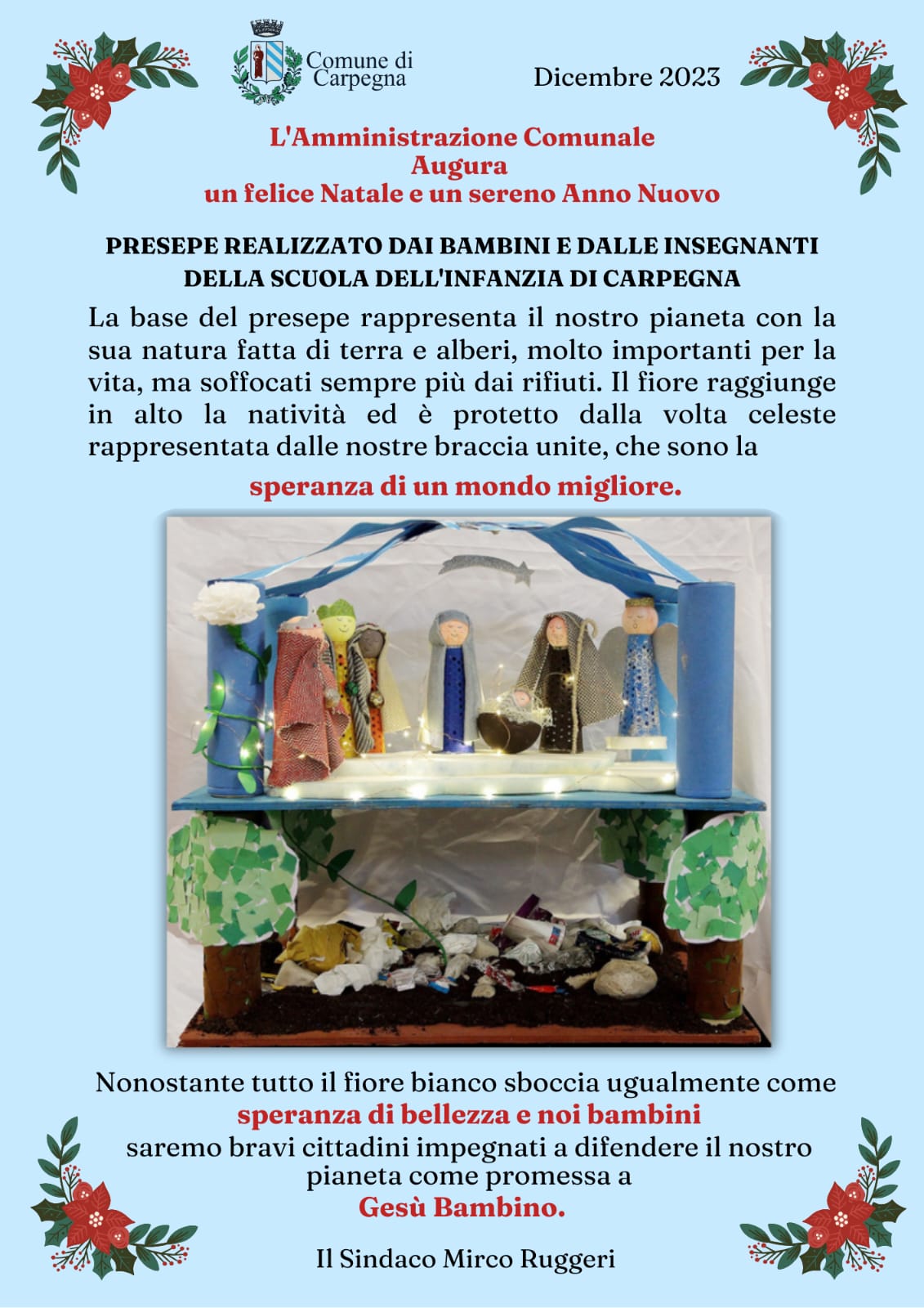 Quest'anno l'Amministrazione Comunale di Carpegna ha scelto di fare gli auguri utilizzando l'immagine del presepe realizzato dai bambini e dalle insegnanti della scuola dell'infanzia di Carpegna che rappresenta la speranza di un mondo migliore.