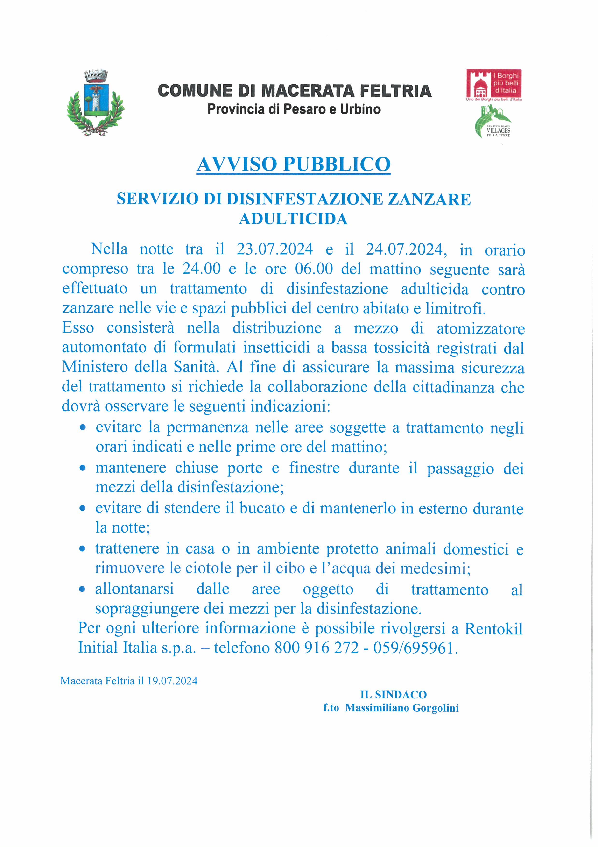 SERVIZIO DI DISINFESTAZIONE ZANZARE ADULTICIDA NELLA NOTTE TRA IL 23.07.2024 E IL 24.07.2024