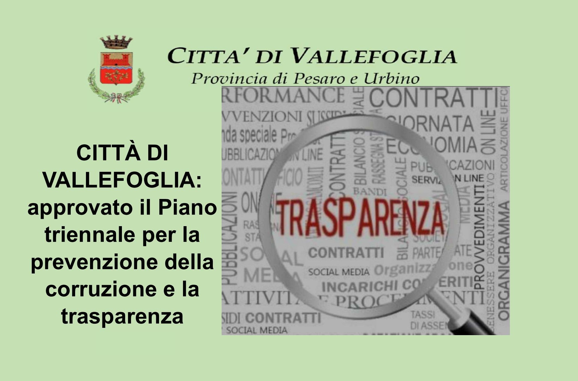 Il Sindaco Sen. Palmiro Ucchielli comunica che la Giunta Comunale nella seduta di ieri pomeriggio, martedì 30 gennaio 2024, ha confermato per l’anno 2024 il Piano triennale per la prevenzione della corruzione e la trasparenza già approvato con deliberazione di Giunta n. 18 del 21 febbraio 2023 e valido per il triennio 2023-2025.