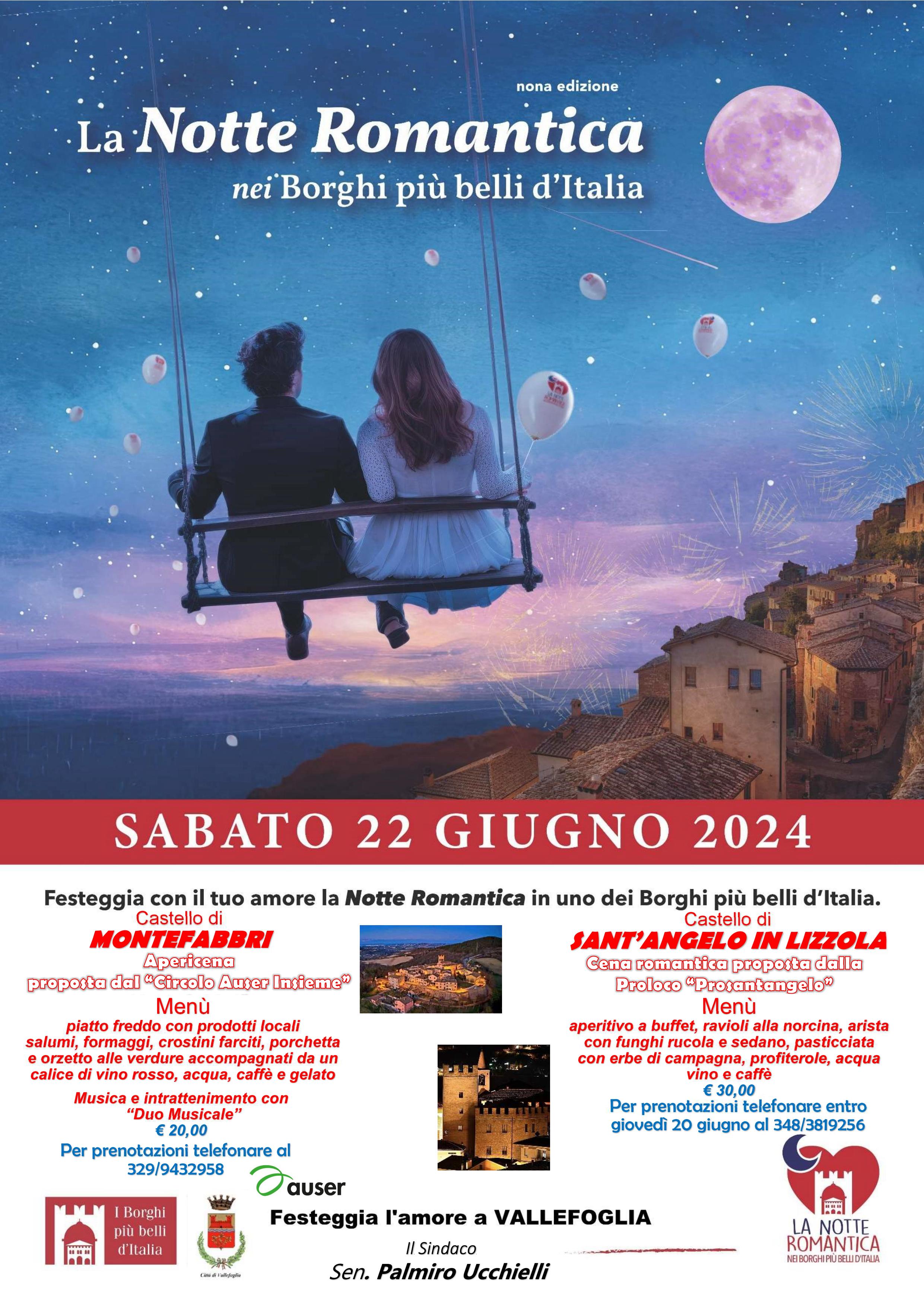 Sabato 22 giugno 2024, comunica il Sindaco Sen. Palmiro Ucchielli, è in arrivo nei borghi di Montefabbri e di Sant’Angelo in Lizzola l’evento nazionale più atteso dell’anno: la “Notte Romantica nei Borghi più Belli d’Italia”.