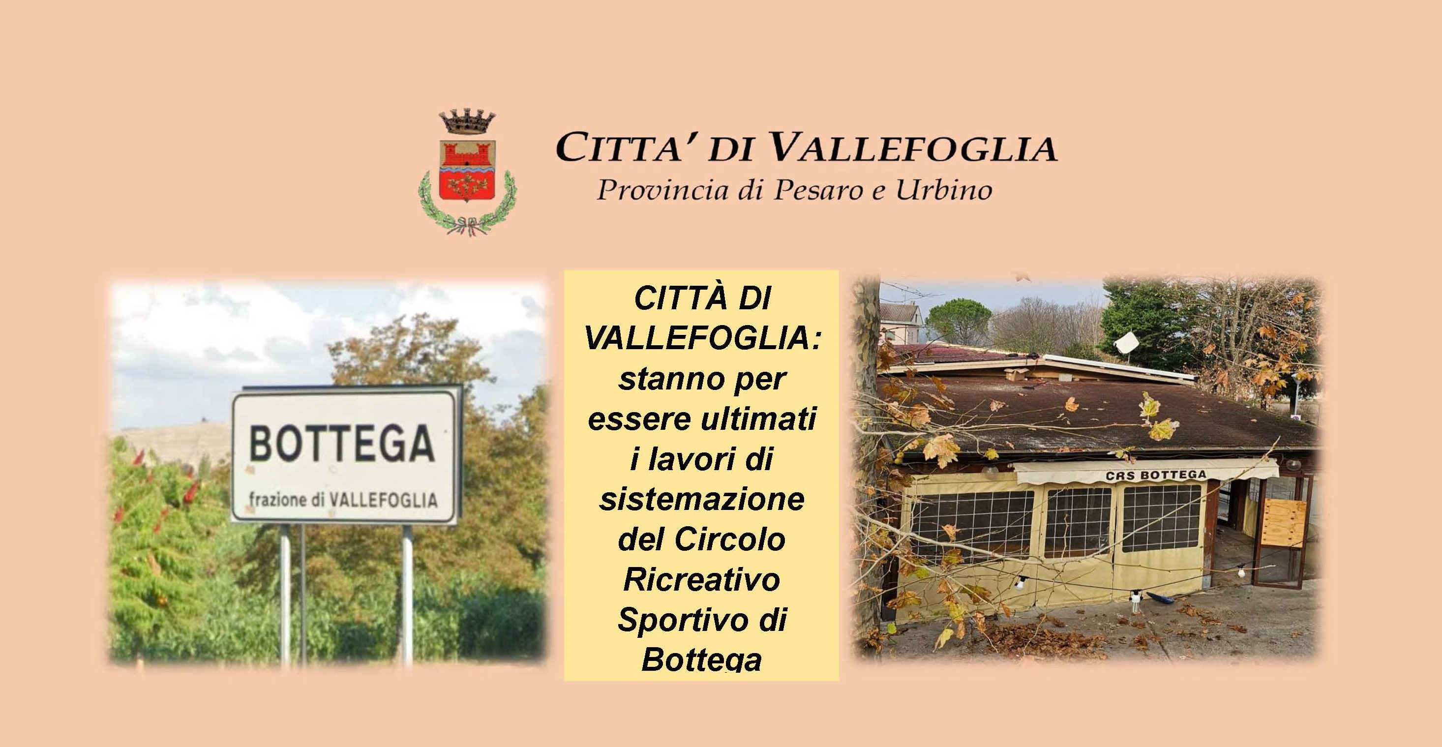 Il Sindaco del Comune di Vallefoglia Sen. Palmiro Ucchielli e gli Assessori ai Lavori Pubblici Angelo Ghiselli e all’Ambiente Dott. Mirco Calzolari comunicano che stanno per essere ultimati i lavori di sistemazione e di riqualificazione del Circolo Ricreativo Sportivo di Bottega.