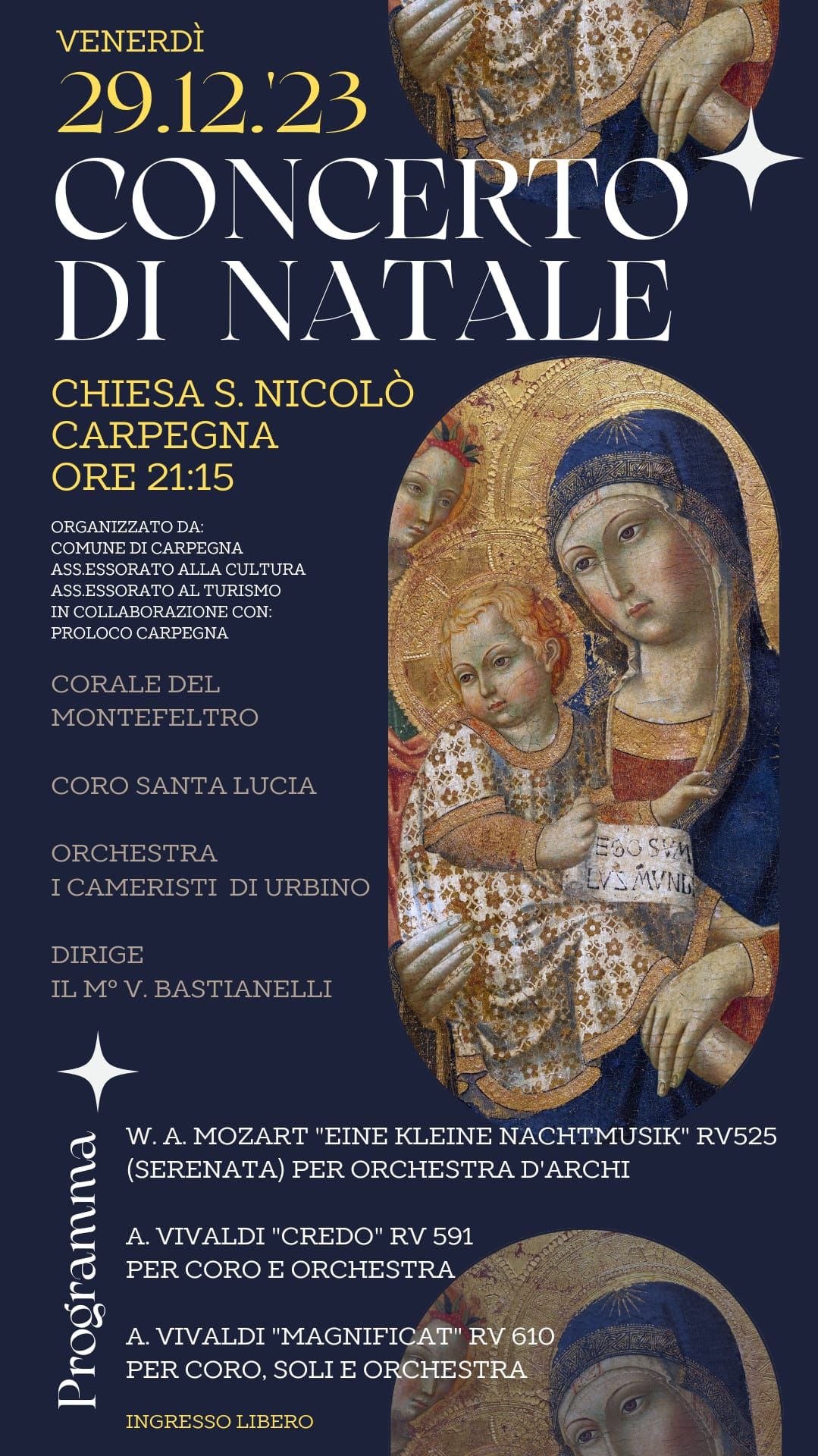 Il consueto appuntamento annuale per il concerto di Natale quest'anno è fissato per il 29 dicembre 2023 alle ore 21:15 presso la Chiesa di San Nicolò a Carpegna.