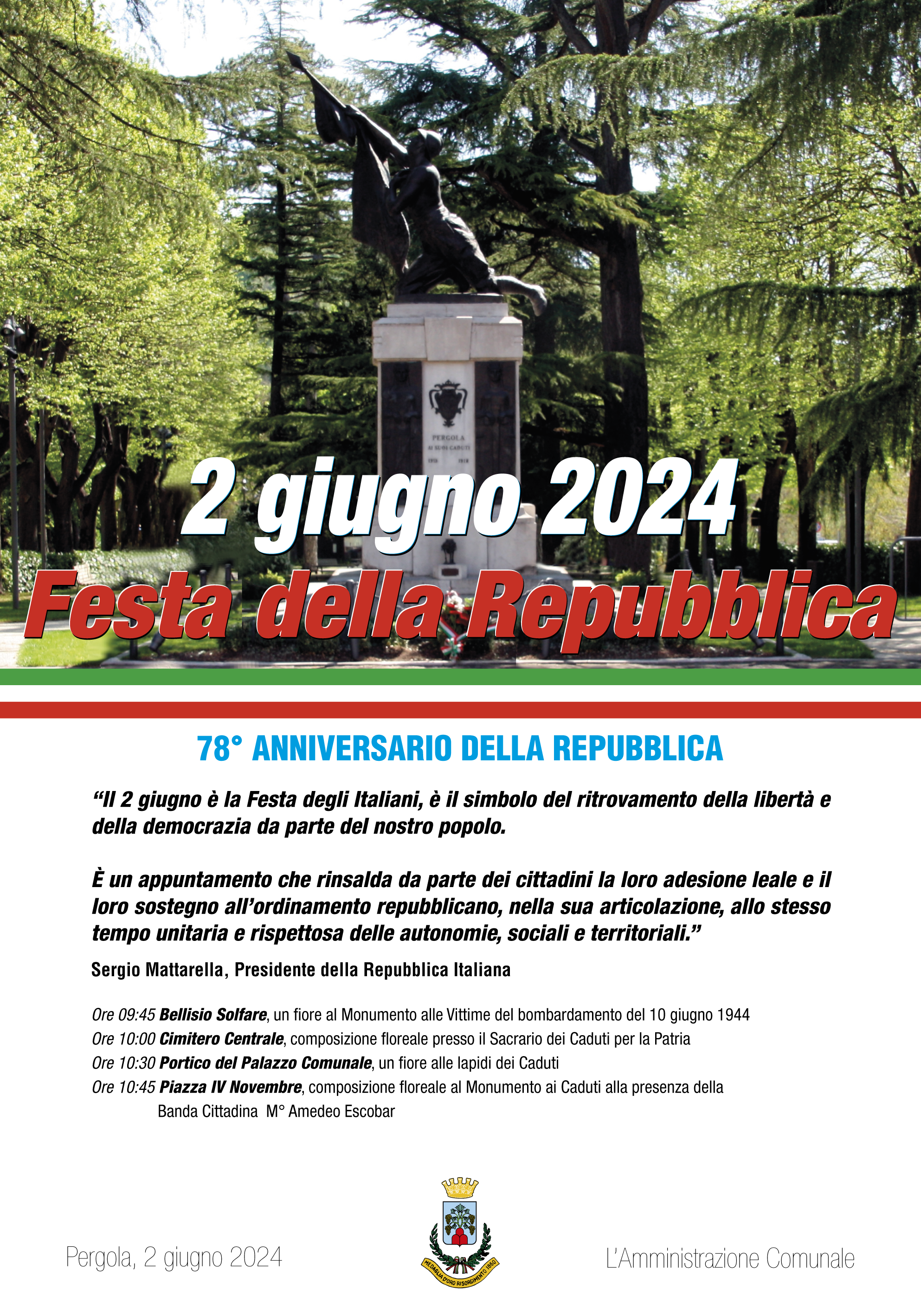 - Ore 10:30 Portico del Palazzo Comunale, un fiore alle lapidi ai Caduti;