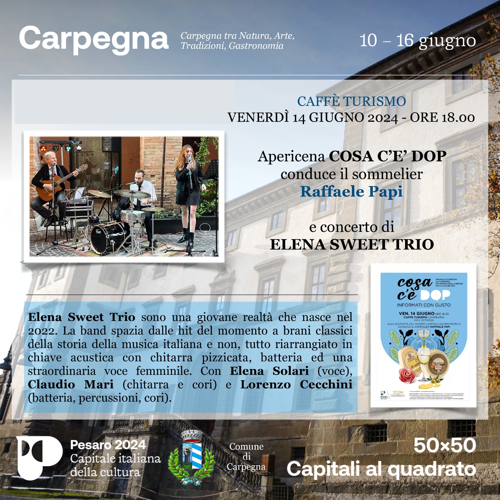 ▶️ Ore 18.00 Apericena "Cosa c'è DOP", con i tre prodotti DOP del nostro territorio: Prosciutto di Carpegna, Caciotta di Urbino, Olio di Cartoceto presso Caffè Turismo con il sommelier Raffaele Papi