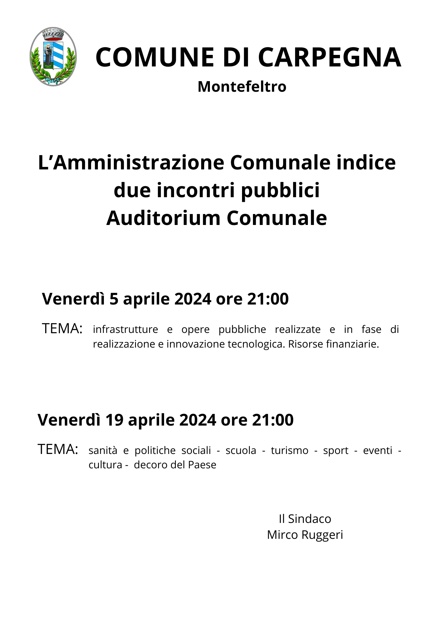 L'Amministrazione Comunale indice due incontri pubblici all'Auditorium Comunale venerdì 5 e19 aprile 2024 alle ore 21:00 per illustrare il proprio operato.