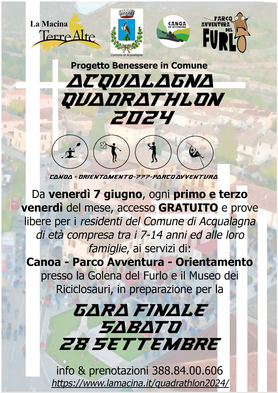 A partire dal 7 giugno, prende avvio il progetto “Acqualagna Quadrathlon 2024”, appuntamenti gratuiti rivolti alle famiglie con minori di età tra i 7 ed i 14 anni, con attività all'aria aperta di carattere sportivo, culturale, sociale ed aggregante e con la possibilità di partecipare ad una competizione finale a squadre.