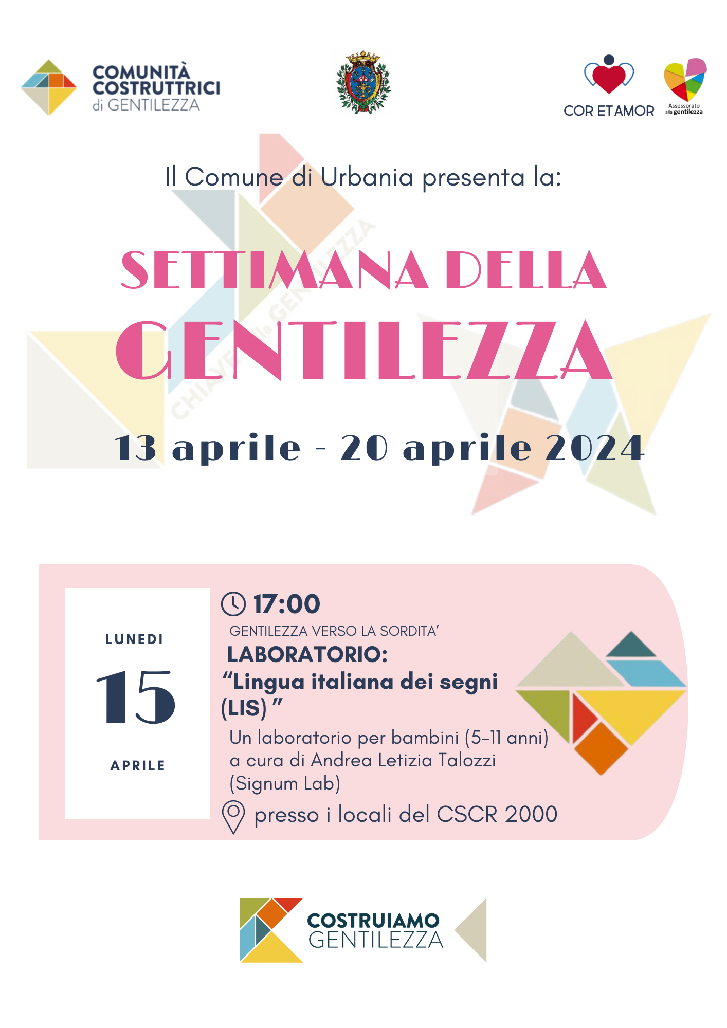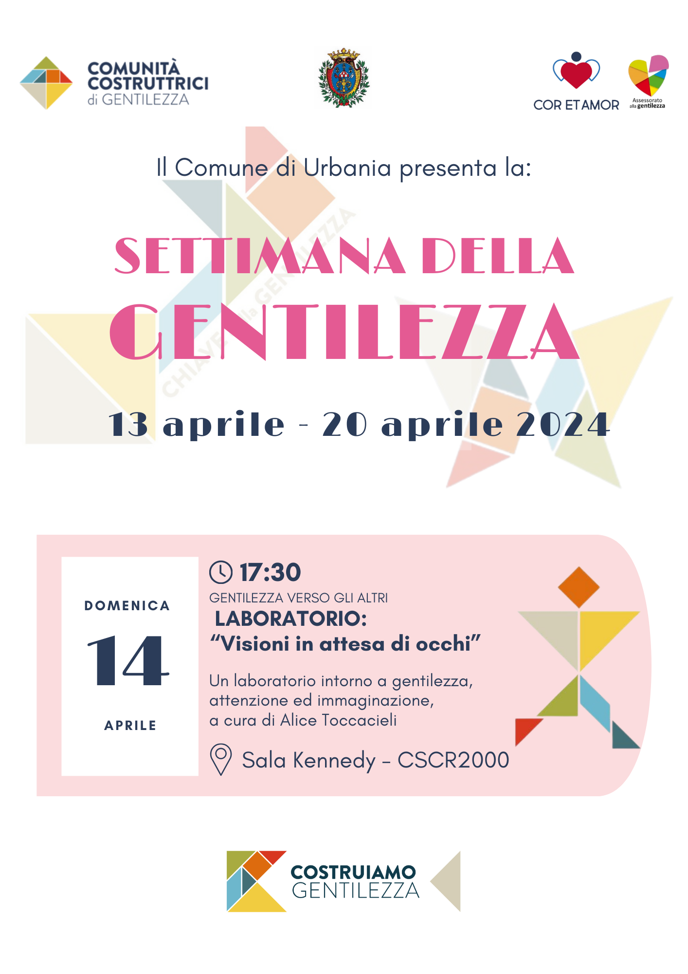 Con lo scopo di trasmettere alla cittadinanza l’importanza dell’ESSERE GENTILI e di praticare la gentilezza a partire dai piccoli gesti quotidiani, verranno organizzate varie iniziative che coinvolgeranno ogni fascia d'età e diversi ambiti dove la getilezza può essere dimostrata.