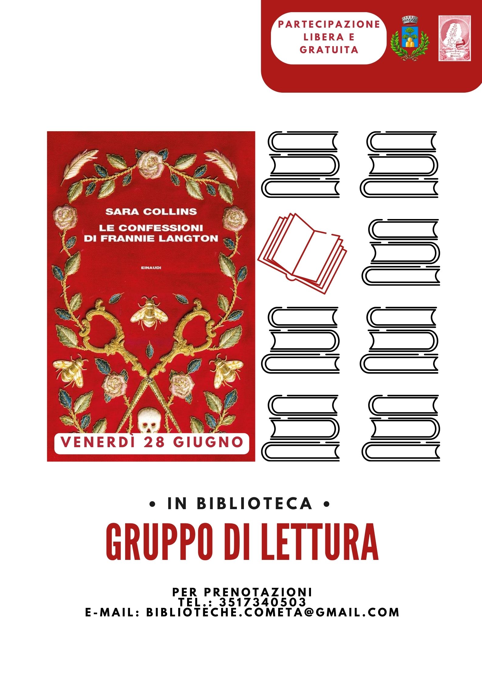 La partecipazione è libera e gratuita, è consigliabile prenotare scrivendo al numero 351 374 0503 o a biblioteche.cometa@gmail.com