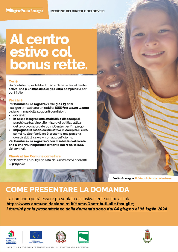 Anche per l’estate 2024 i Comuni del Distretto di Riccione (Cattolica, Coriano, Gemmano, Misano Adriatico, Mondaino, Montefiore Conca, Montegridolfo, Montescudo-Montecolombo, Morciano di Romagna, Riccione, Saludecio, San Clemente, San Giovanni in Marignano, Sassofeltrio) hanno aderito al “Progetto per la conciliazione vita-lavoro”, promosso dalla Regione Emilia Romagna con DGR n. 365 del 04/03/2024 e finanziato con le risorse del Fondo Sociale Europeo.