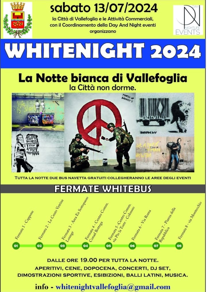 Quella che ci apprestiamo a trascorrere sarà un fine settimana intenso e ricco di spettacoli, a comunicarlo sono il Sindaco della Città di Vallefoglia Sen. Palmiro Ucchielli e il Consigliere comunale delegato ai grandi eventi Debora Denti. Si inizia già da domani sera, sabato 13 luglio 2024 dalle ore 19,30 con l’apertura ufficiale di “Whitenight2024”, la Notte Bianca della Città di Vallefoglia, organizzata dall’Associazione di Promozione Turistica, Culturale e Sociale Day and Night Events in collaborazione con l’Amministrazione Comunale. Anche quest’anno, comunica il Presidente dell’Associazione Giovanni Mengarelli, l’evento coinvolgerà tantissime attività commerciali che interesseranno le frazioni di Montecchio, Bottega, Morciola e Cappone. Tanti sono anche gli eventi organizzati per intrattenere il grande pubblico ad iniziare dai ristoranti, le gastronomie, i bar e i pubblici esercizi che proporranno menù enogastronomici con prodotti tipici locali accompagnati da intrattenimenti ed eventi musicali e spettacoli di ogni genere per grandi e piccini.