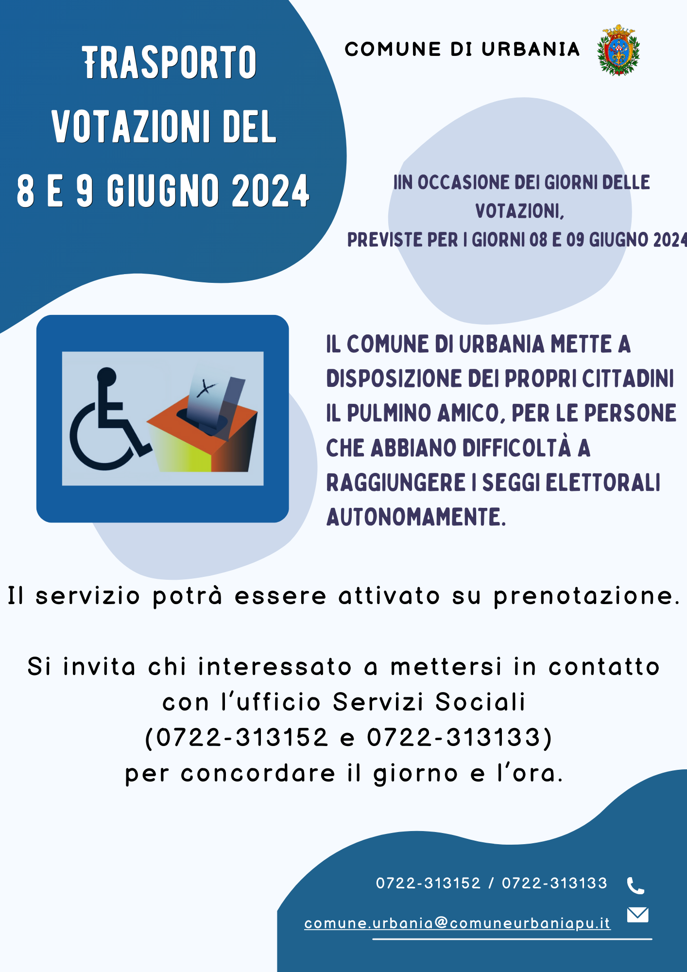 In occasione dei giorni delle votazioni, previste per i giorni 08 e 09 giugno 2024, il comune di Urbania mette a disposizione dei propri cittadini il pulmino amico, per le persone che abbiano difficoltà a raggiungere i seggi elettorali autonomamente.