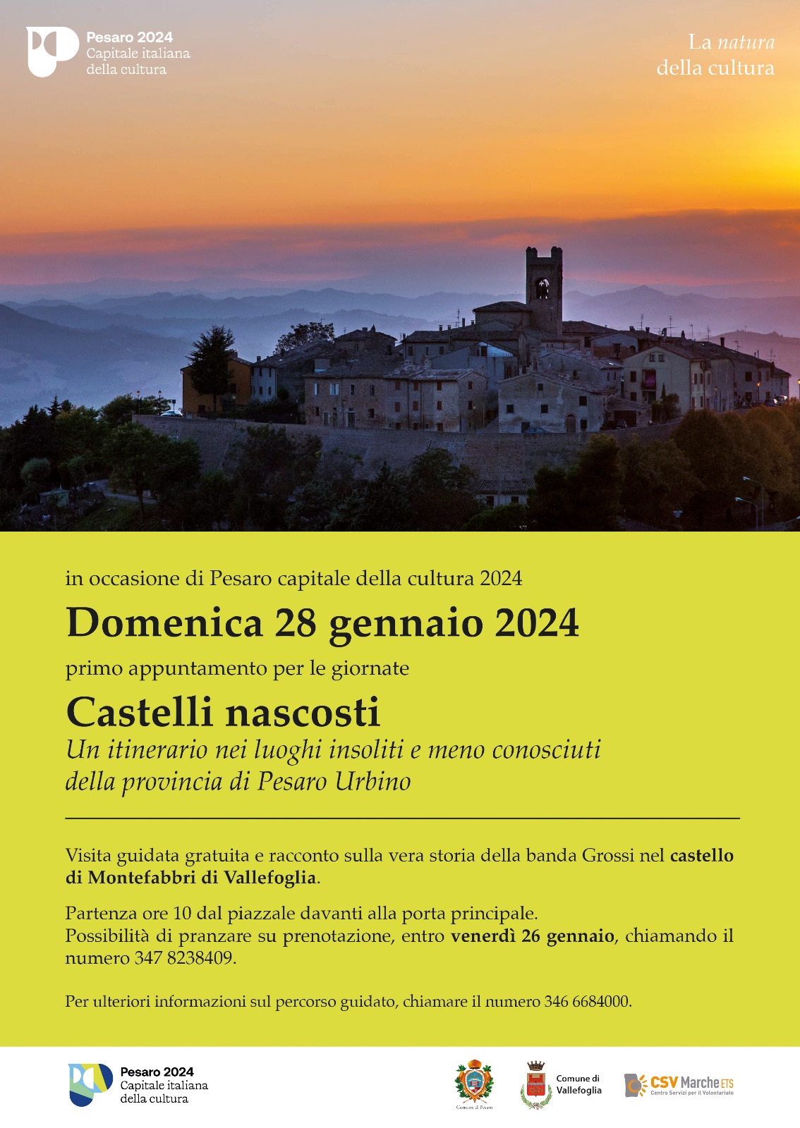 Il Comune di Pesaro e di Vallefoglia, in collaborazione con CSV Marche, il Centro Servizi per il Volontariato, propongono infatti la realizzazione di un percorso guidato con Alessandra Mindoli per la visita del Castello di Montefabbri incluso all’interno del progetto Fuori Pista “Castelli nascosti” ideato dalla guida.